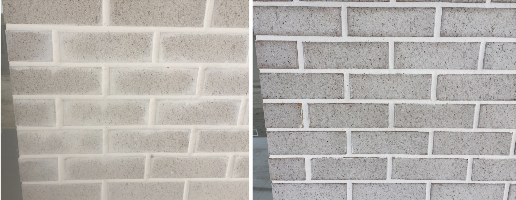 Many Melbourne brick cleaners (acid washers) have done a tremendous job as they have learned how to use acid, turbo heads and fan nozzles to clean, shape and restructure hard mortar beds that were left uncut and unbrushed with excessively thick splatter and smeared mortar on the brick face (up to 8-16 mm thick). We often see jobs with aged and extremely hard mortar that were rolled with a piece of plastic pipe found onsite and not even cut or dry brushed. It is impossible to clean these jobs and leave a sharp crisp polished mortar bed finish. When plasticisers and white cements are used in the mix the mortar becomes even harder and stickier. These j0bs become impossible to clean without damage, especially in the time frame that builders costings allow. Plasticizers and the use of the new high MPA cements has increased the hardness and thus the degree of difficulty to clean and this has increased the time required to clean these jobs by 3 to 5 fold or more. Most builders will not pay for this extra time until they learn from bitter experience the costs involved to fix the damage done by”the Estate Acid Washing Turbo Warriors” trying to clean these hard dirtily laid jobs with mortars laden with admixtures cheaply with acid and turbos is nothing compared to the cost of proper rectification.