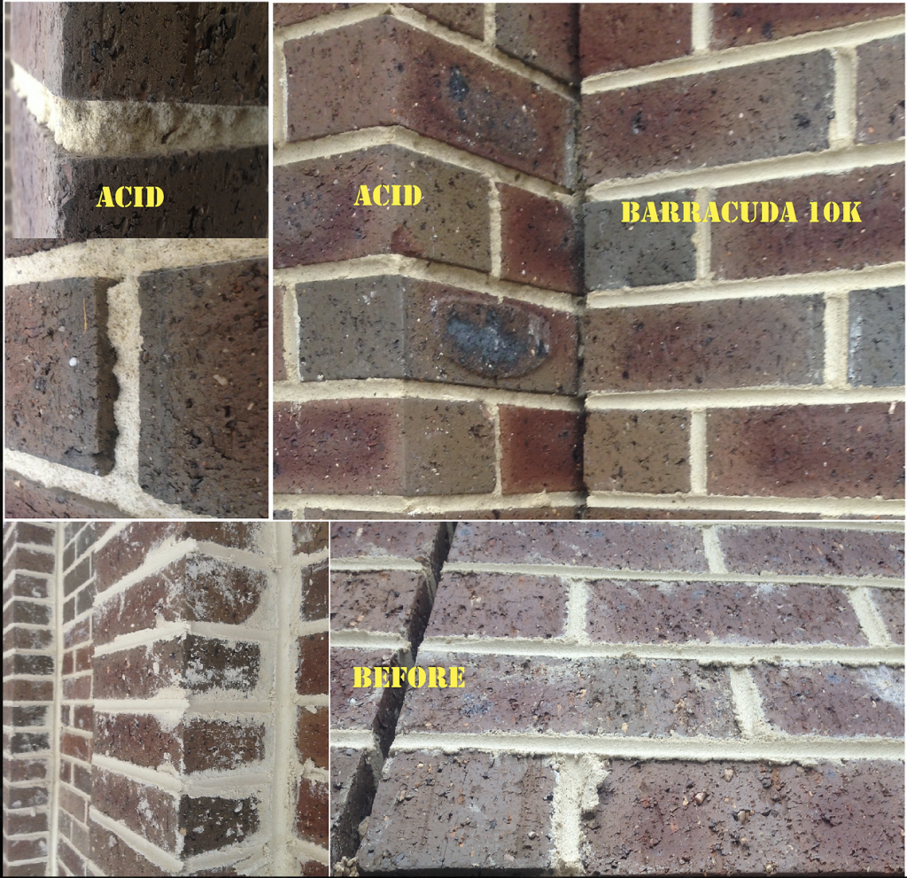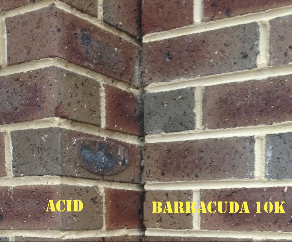 Over the last 30-40 years the cleanliness of the general finished quality of the brick work in Melbourne has deteriorated to being arguably the worst in Australia and probably the worst in the world. Builders and supervisors have accepted this poor workmanship and have hidden or stopped monitoring the consequential financial costs to repair the damage caused by Hydrochloric Acid from cleaning these jobs because they had no alternative. Even worse is the fact that they have a mechanism in their contracts to recover costs from the brickies and cleaners if it goes wrong. Therefore they have eliminated any responsibility to try to make sure that they are laid clean and in a state that they can be cleaned without damage from acid treatments. Even OH&S managers have had to accept the risks of Hydrochloric acid being on site. Barracuda 10K offers a solution to this.