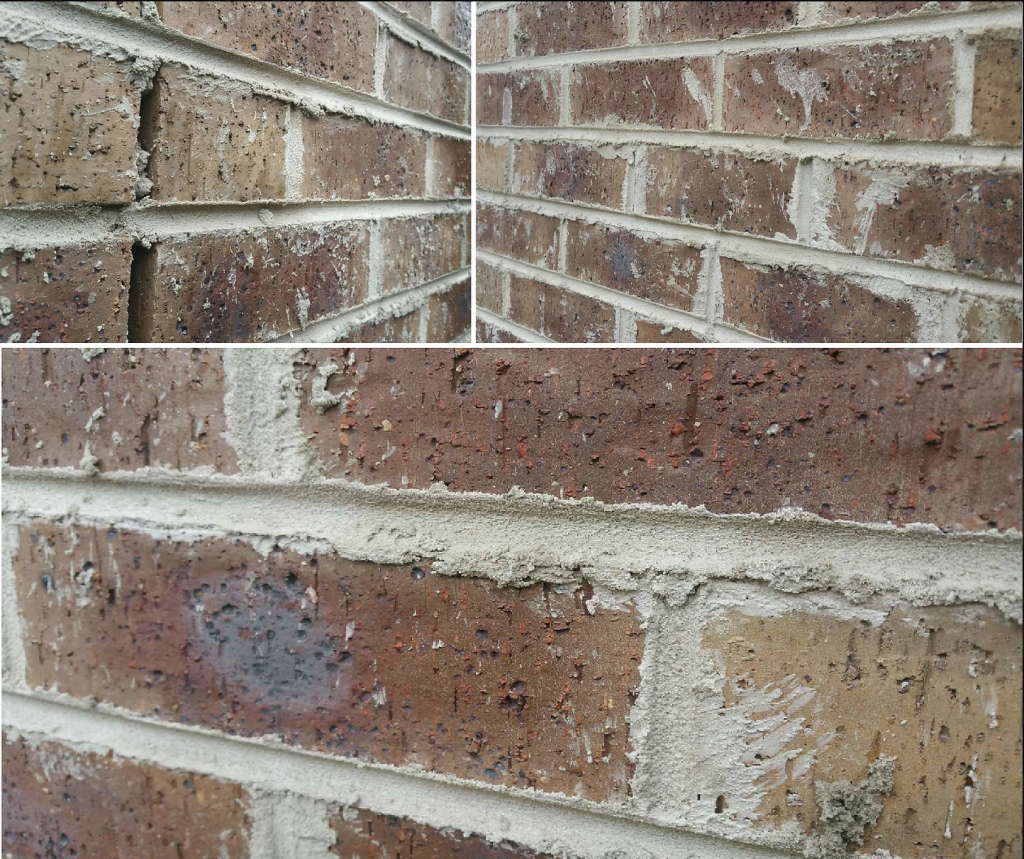 In Melbourne, very few builders or supervisors have a bricklaying background nor have they the time to understand how to lay bricks cleanly and mix mortar correctly, so the bricklaying quality can be very low (see below for typical examples). Forty years or more of a continued shortage of bricklayers has exacerbated the problem. Builders continually lowered their standards and took on anyone to get their work done on time. This led to an acceptance of the poor quality of workmanship shown below (pictures) while the use of pressure washing with acid grew simultaneously as an alternative fast and cheap cleaning method. This helped cover up the deterioration of the poor finishing quality. Collateral damage by acid was ignored, not costed, and became acceptable as there was no perceived alternative and the art of laying clean has become ignored and even worse forgotten.