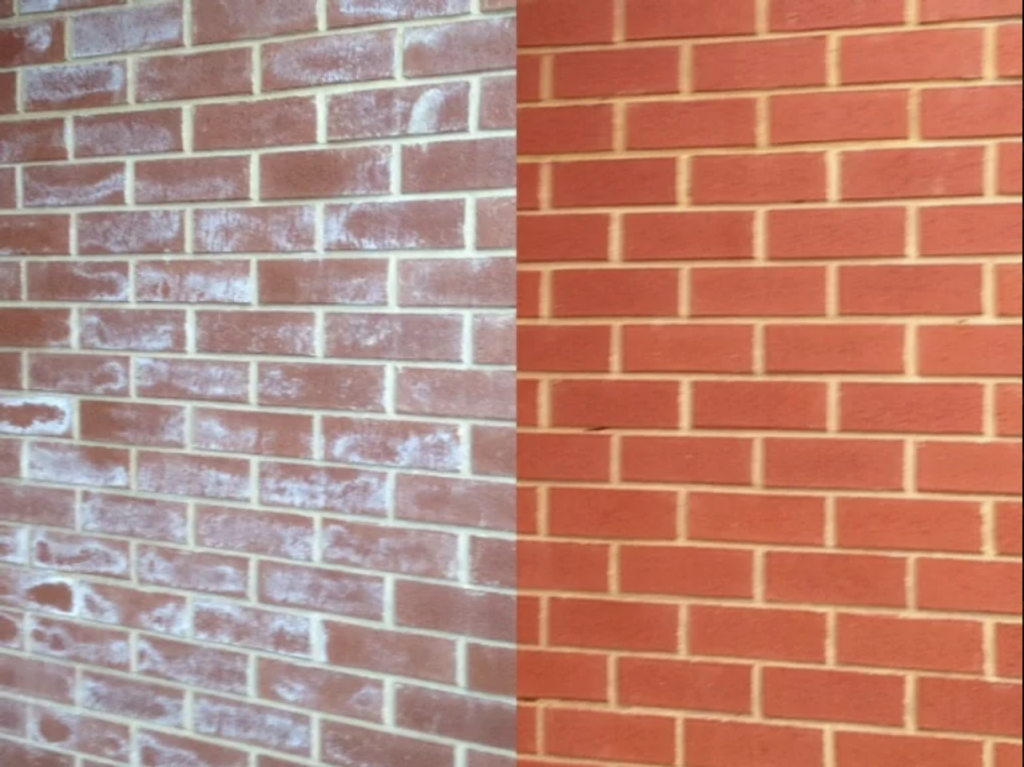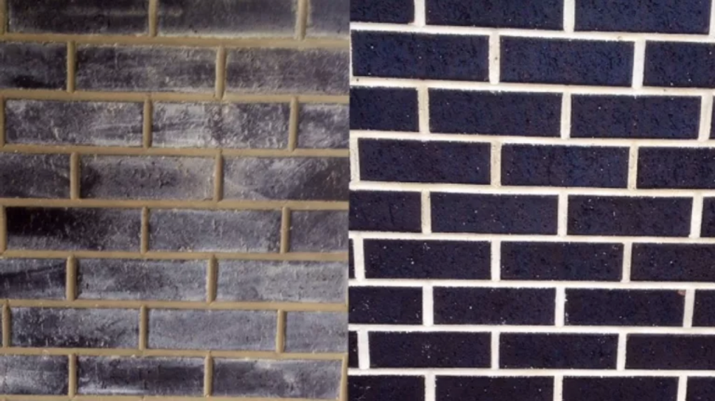 A very toxic chemical (Hydrofluoric acid) is required to try to remove this “stain” aka “salts”. This problem can be prevented by frequently rinsing the sponge out with clean or fresh running water (best option). Wet sponging heavily textured bricks can also push the mortar deep into the brick face so care must be taken. Alternatively, if you cut and dry brush all surface mortar with a firm brush when its crisp the deposits and smear will be virtually eliminated, and this will allow us to clean with B10K and give a perfect finish.