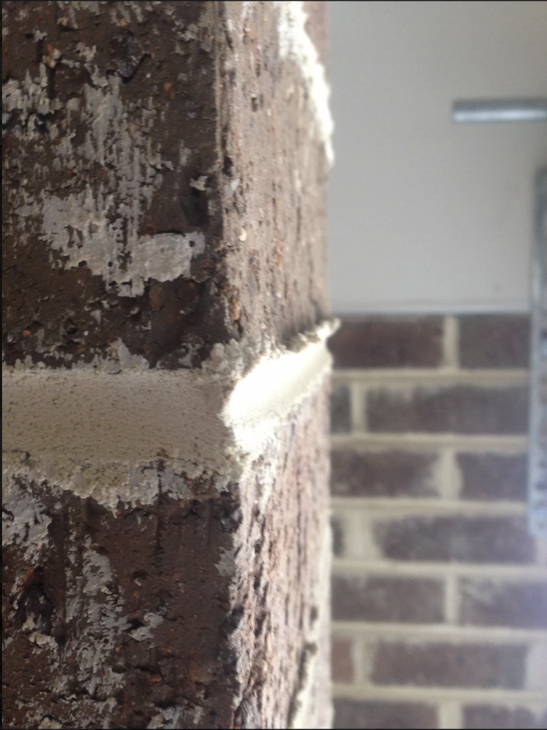Failure to brush after cutting leaves difficult to clean lips, ridges and eyebrows of mortar on the edges as well as thick mortar smear covering the bricks. These are very difficult to remove once the mortar sets and will make the cleaning job look rough and give a ragged edge. The bricks below needed hand scraping and multiple applications of B10K to end up with a clean sharp finish. Each pass takes off a tiny layer from the surface of the mortar (and some bricks). However mortar beds will not appear acid damaged as B10K is much more gentle than Acid although there is a limit to the number of passes before the mortar becomes damaged. Please note that if you have to remove 5-10mm (or more) of mortar from the brick face with acid then it will be difficult to stop it removing similar amounts from the mortar beds.