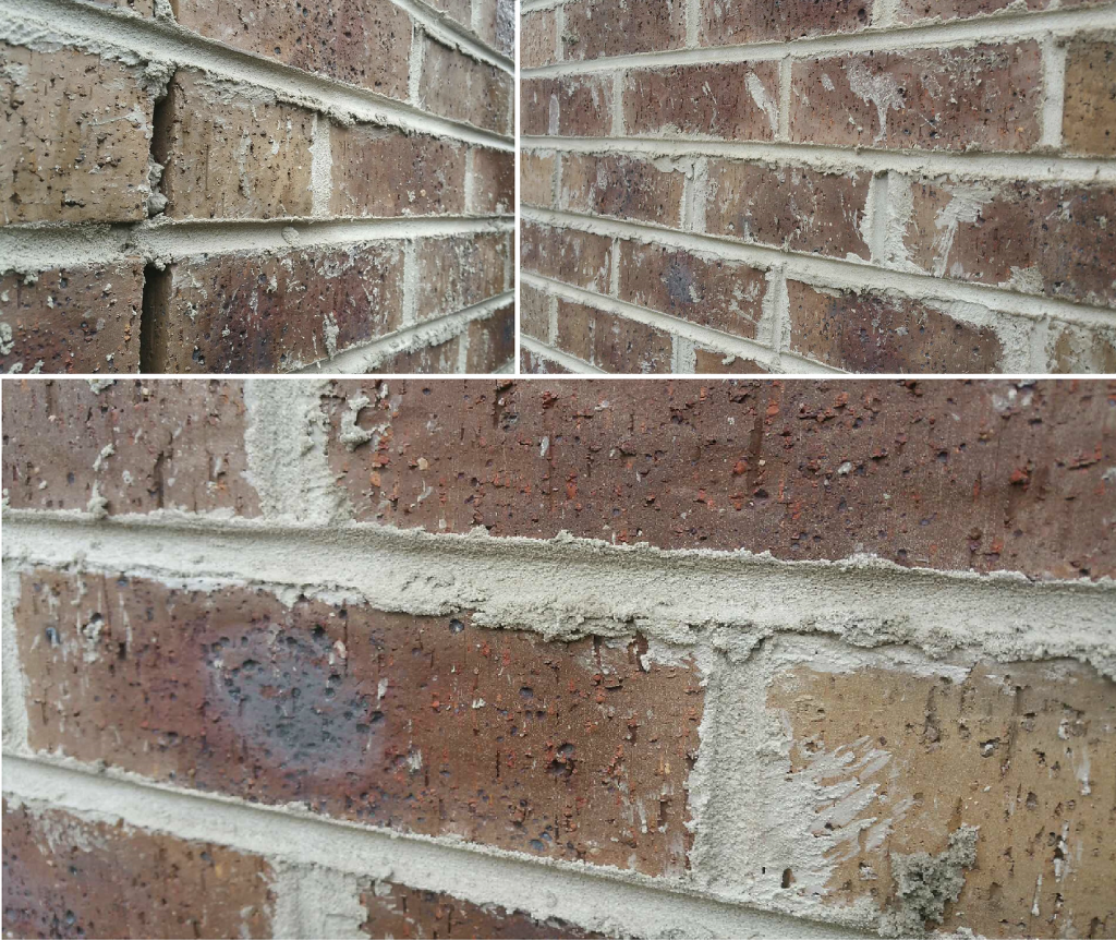 Below are pictures of some typical work that is quite common in Melbourne. These bricklayers have stopped using jointing tools and they don’t cut the edges, there is no brushing and they don’t remove or clean splatter and none ever sponge clean. These processes have been eliminated to increase their speed and make more money. There is no consideration for the quality of the end result and they continue doing it because they are not accountable for, or don’t understand, the cost and collateral damage that will occur from cleaning this type of work with acid and pressure washing.